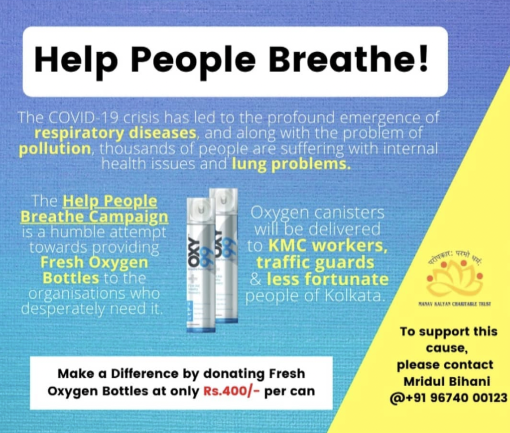 Manav Kalyan is a charitable trust which focuses on the betterment of people. During the pandemic I started a campaign called “Help people breathe!” In which I Collected funds to donate oxygen cans to the people in need. I collected a total of 1,14,400 rupees (1515$) which yielded 286 cans to donate. I donated 100 cans to Rural health care Foundation, kolkata and covid warriors like the policemen, doctors and the nurses who risk their lives for us. I also donated the other canisters to rural hospitals for COVID-19 positive patients who needed oxygen in times of emergency. This campaign was an overall success and I learnt how to manage excel sheets, do proper distribution, make contacts and talk to people.